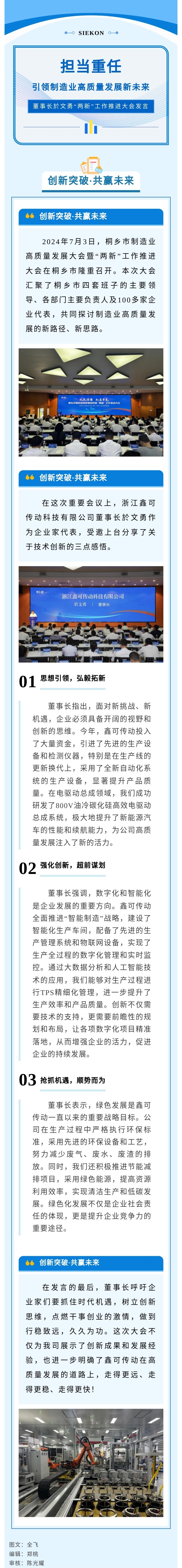 擔當重任|引領制造業高質量發展新未來暨董事長於文勇“兩新”工作推進大會發言 2024-07-11 16:05:13 浙江鑫可傳動科技有限公司 瀏覽次數 1210 上一條嘉興市委書記陳偉深入鑫可調研,共話企業發展新篇章 下一條開展TPS培訓 推動企業精益管理